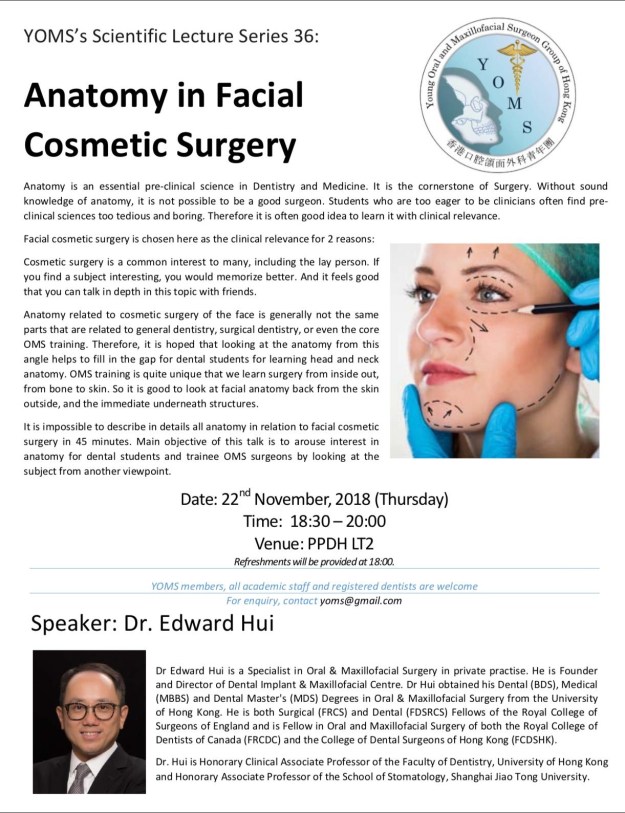 Throughout all these years, YOMS has been aiming to promote oral and maxillofacial surgery to mainly BDS students and trainees; we hope that all had been benefited from the lectures or workshops that we held.